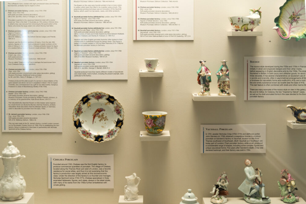 The Mint Museum’s collection of 18th-century British pottery and porcelain is widely respected for its scope and quality. The collection numbers over 2,000 objects and includes important examples of both salt-glazed and dry-bodied stoneware from Staffordshire; tin-glazed earthenware from Bristol, Liverpool, and London; and cream-colored earthenware from Derbyshire, Staffordshire, and Yorkshire. Notable 18th-century porcelain factories represented include Chelsea, Bow, and Vauxhall in London, Longton Hall in Staffordshire, Worcester, Bristol, and others. Individual works in the collection are exceptional because of their rarity, craftsmanship, provenance, or as representative examples of particular types or methods of production or decoration.