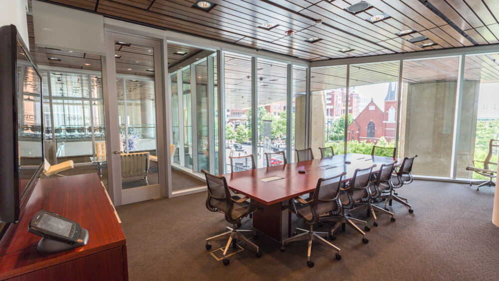 This grand space features a 60-by-60-foot glass wall overlooking Levine Avenue for the Arts and the Knight Theater. Summer Wheat’s Foragers reflects like stained glass, pictured on the left. The dramatic interior includes richly stained hardwood floors and a wood slat ceiling.