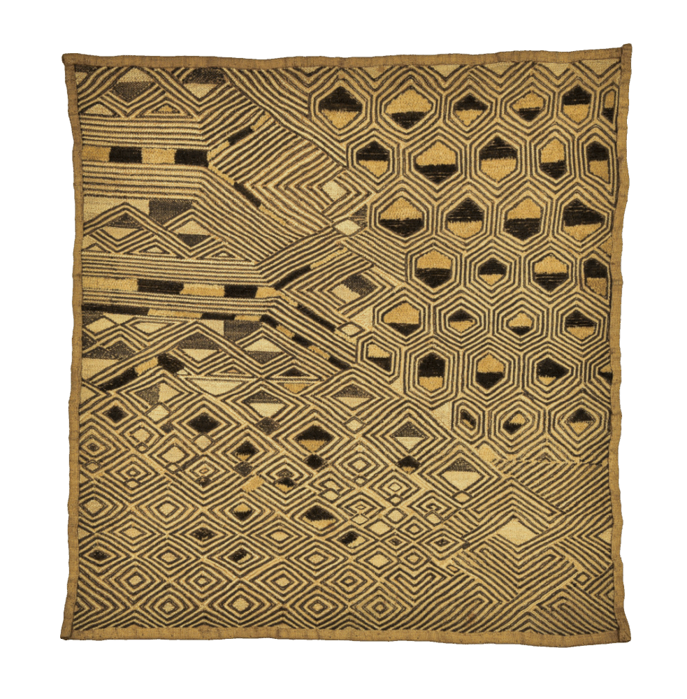 Originating from the Democratic Republic of Congo, Kuba raffia cloths are rich in cultural significance. Traditionally used in royal courts or funerary rites, the cloths on view primarily from the 1980s, reflect generations of craftsmanship and spiritual expression. These prestige textiles have long fascinated the global art world. By the late 19th century to early 20th century, they appeared in the European markets and were acquired by artists such as Henri Matisse, Suzanne Valadon, and Sonia Delaunay.